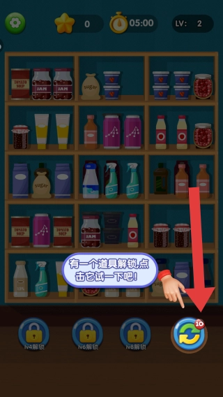 2、存在一个道具解锁提示,点击后就能免费使用此道具。玩法为整理货架上的物品,借助道具辅助来通关。