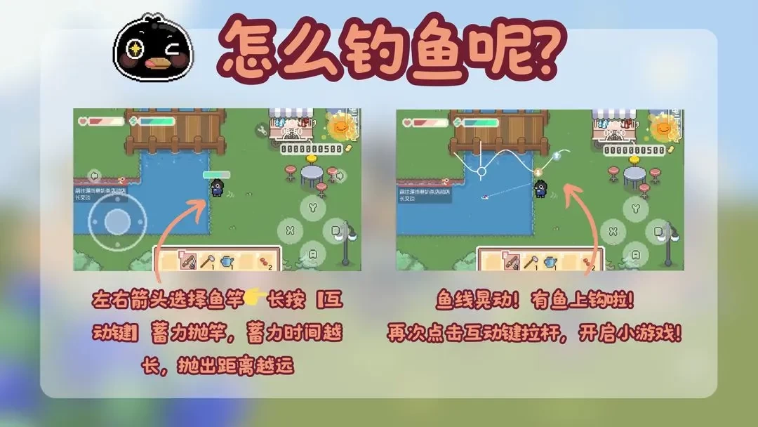 用左右箭头选择鱼竿,接着长按互动键蓄力来抛竿,蓄力的时间越久,鱼竿抛出的距离就越远。