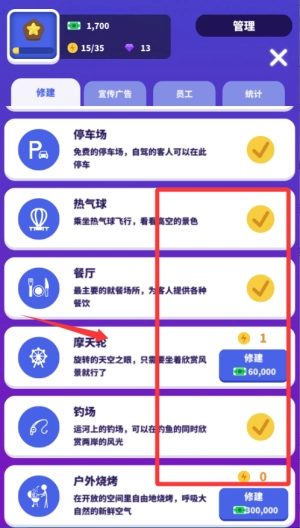 在深度经营玩法中,玩家要对游客中心的基础运营进行合理规划与资源调配,通过逐步积累资金解锁更多高级设施,最终完成从简陋场地到豪华度假区的华丽转变。