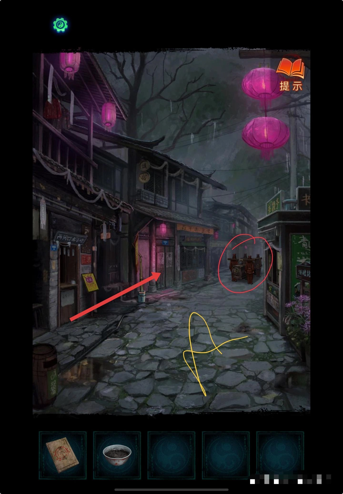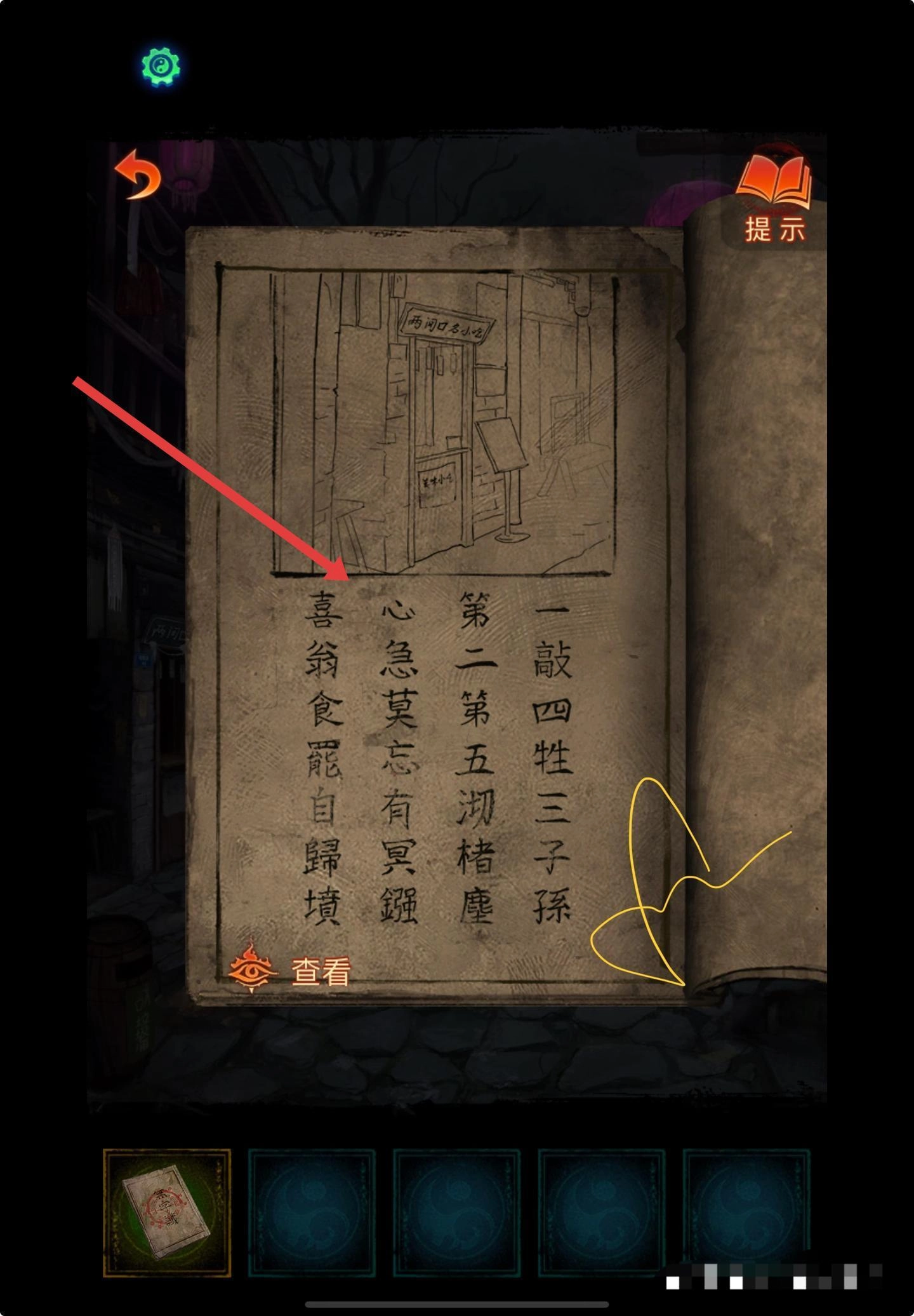 查找古籍中的相关线索,对文字内容进行解读,然后前往对应的小吃摊,寻找可以互动的地方。