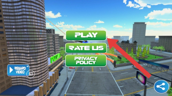 有【PLAY】标识,还有“RATEUS(给我们评分)”“PRIVACYPOLICY(隐私政策)”“REWARDVIDEO”这些标识,另外也包含城市建筑、道路之类的场景元素。