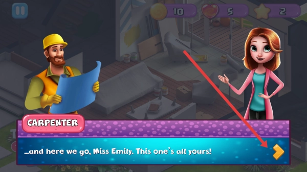进入剧情对话后,你可以通过点击箭头按钮来推进对话流程,跟随木匠与Emily的交流内容,从而开启设计任务。