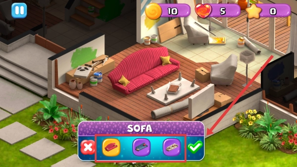 在沙发设计这一步,留意箭头所指的方向,接着从下方给出的选项里挑选出你喜欢的款式,之后点击对勾来确认选择,这样就完成沙发的设计与布置了。