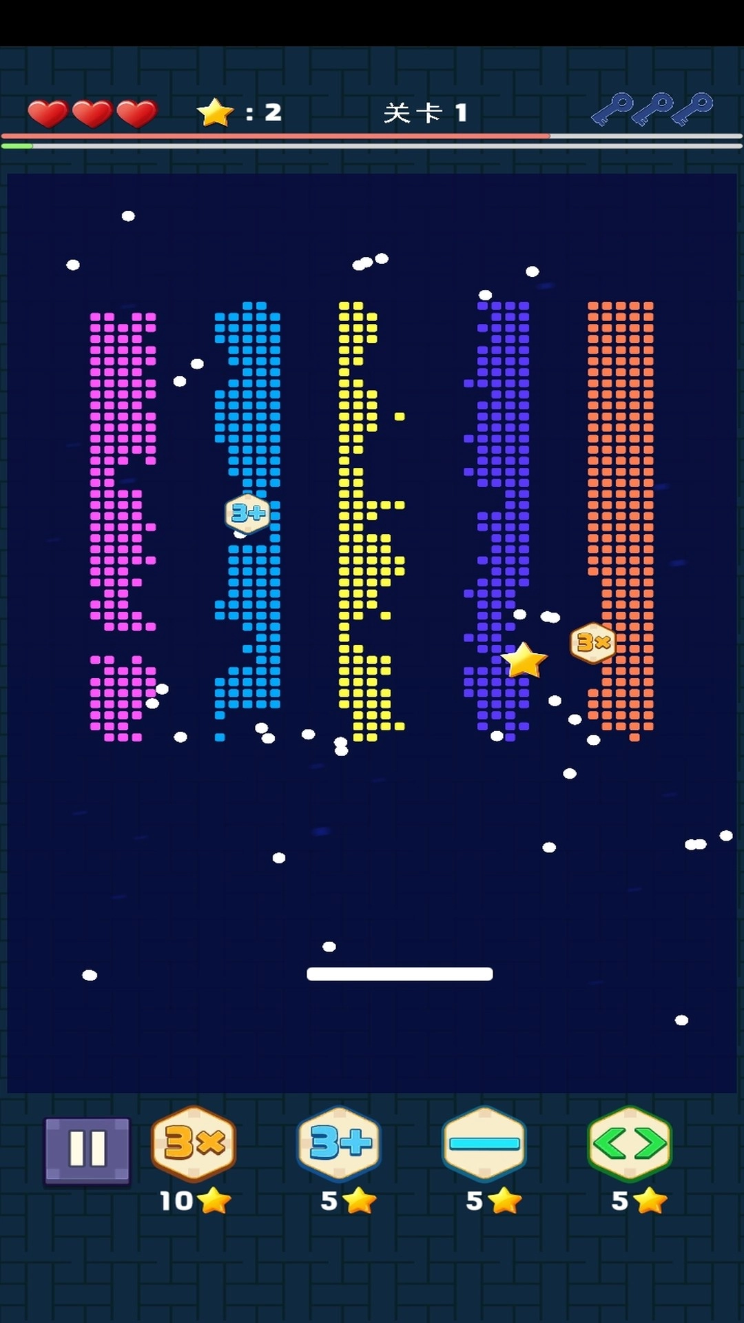 资源收集系统:击碎带有问号标识的金色砖块可获取各类道具,像“体积膨胀剂”“轨迹预测线”“一键清屏炸弹”等,这些道具能在关键时刻扭转战局。