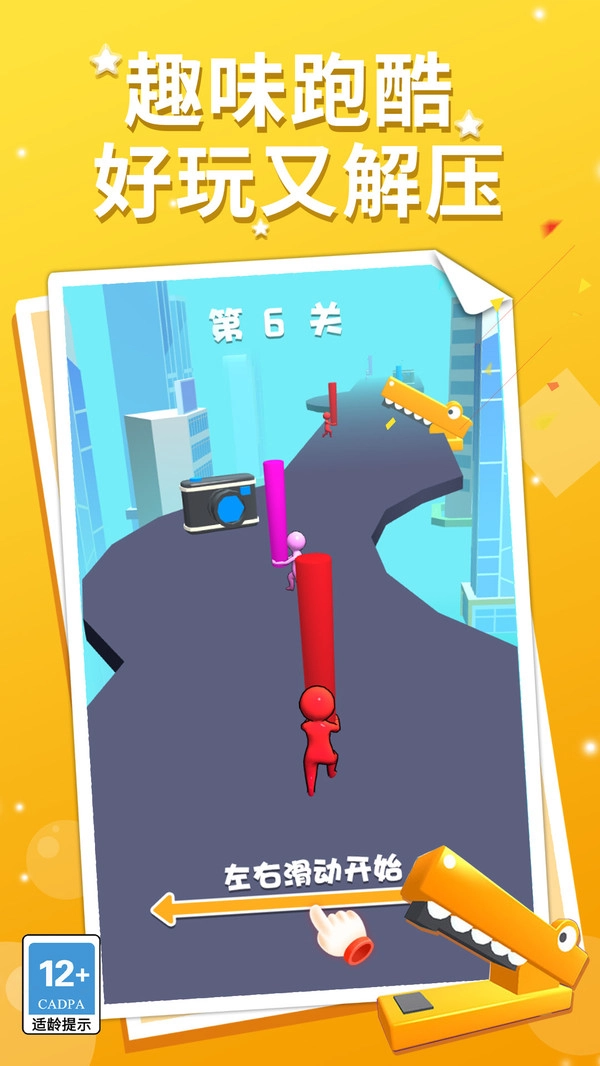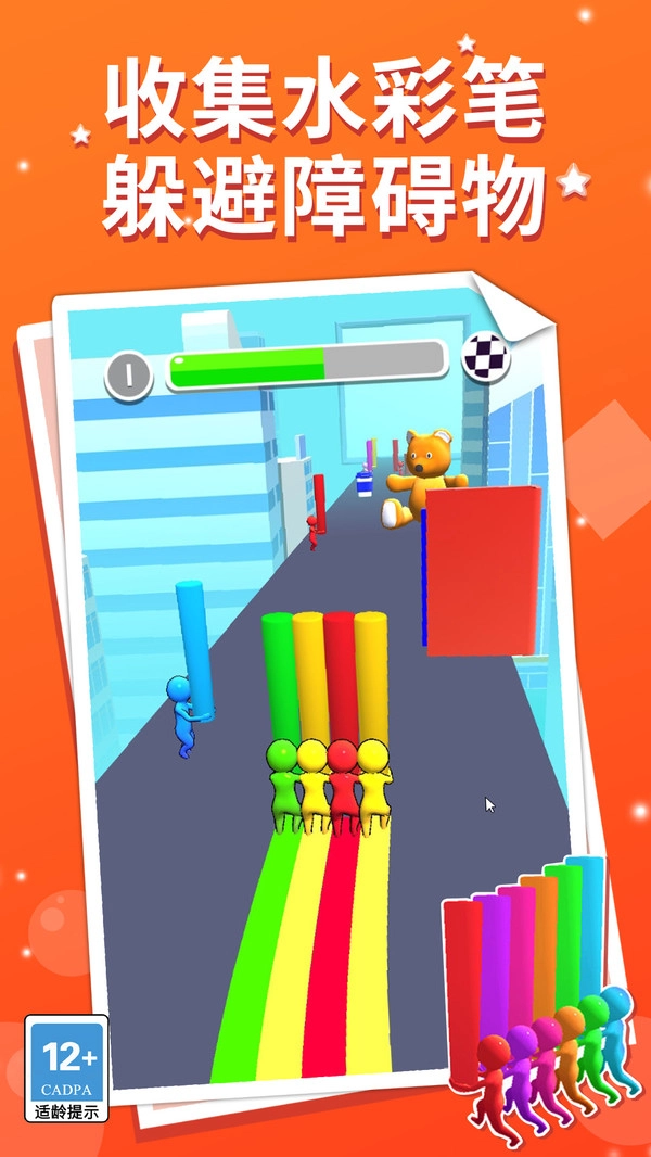 通过左右滑动来控制角色移动,巧妙避开前方的各种障碍,与此同时还能收集不同颜色的彩笔。