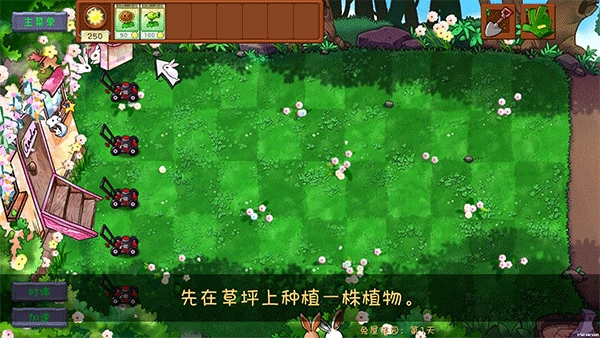 在选定兔屋花园场景后,进入第一关界面,完成植物的挑选配置,随后点击“一起摇滚吧!”的启动按钮,即可正式开启该关卡的挑战。