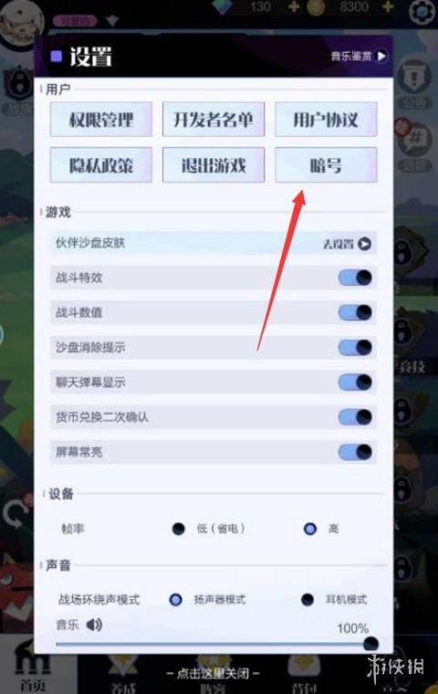 在设置界面中,找到并点击“暗号”按钮。