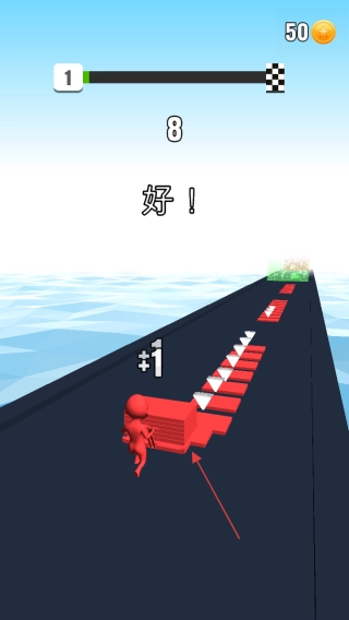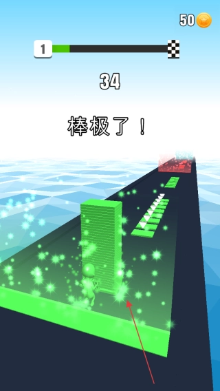 不断向前移动,把捡到的方块一层层叠起来,争取拿到更亮眼的成绩,最终到达关卡的尽头,成功通过这一关的考验。
