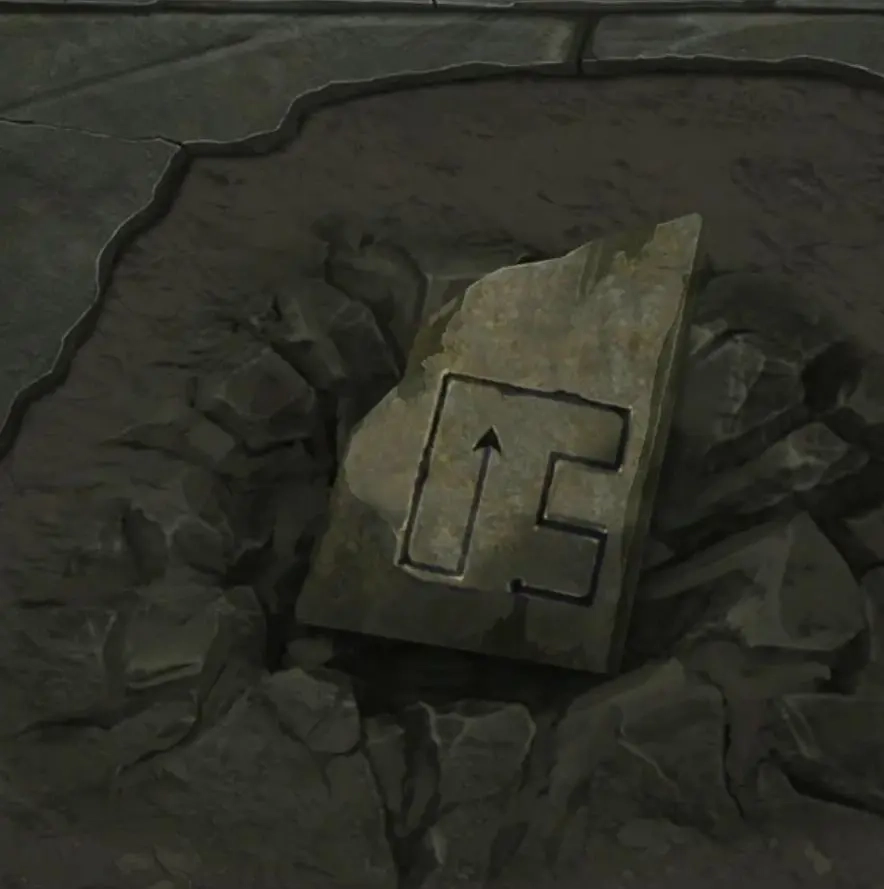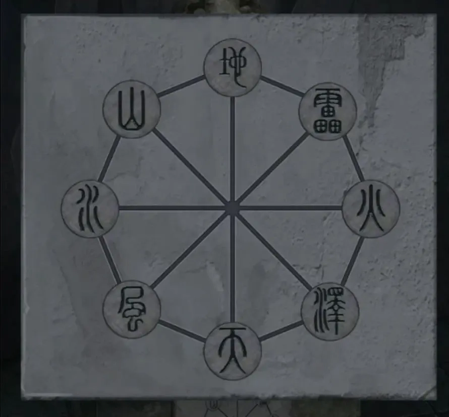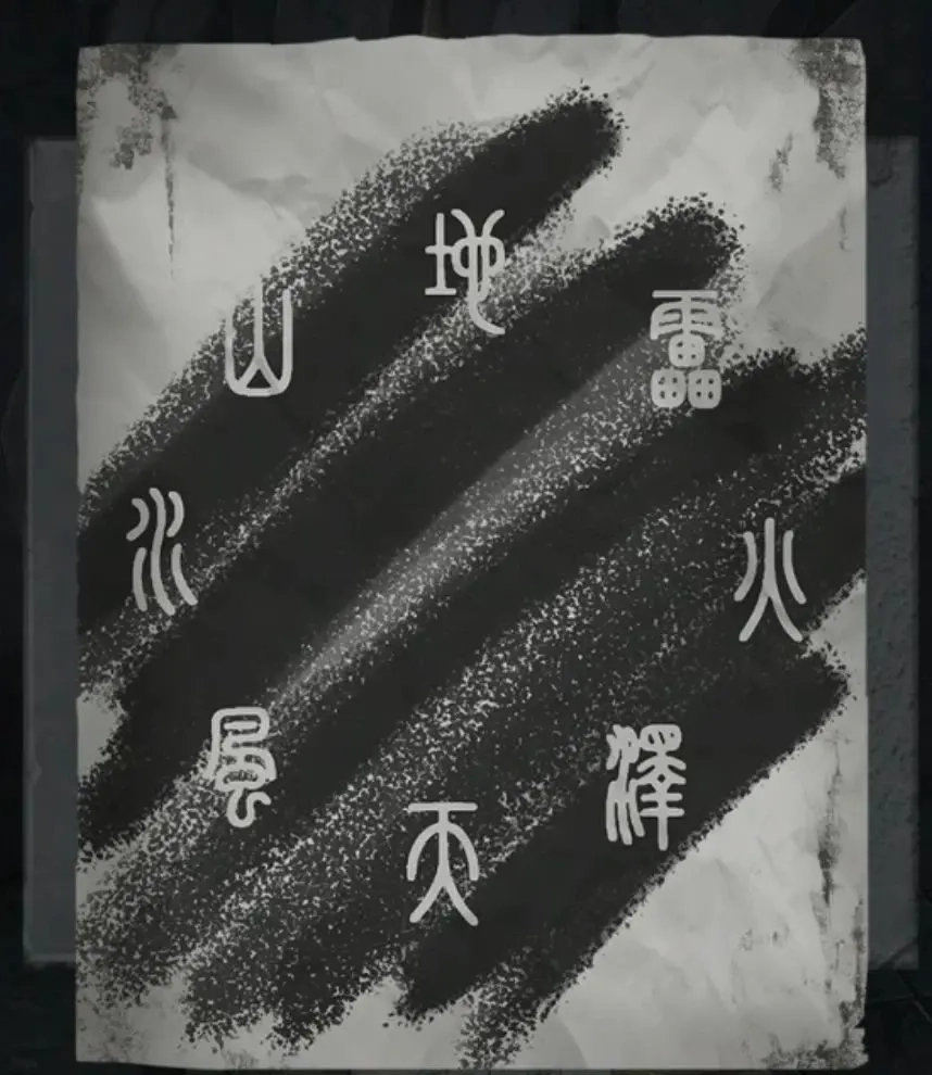 手中的拓片对应着左侧雕像的解谜提示,在该石像处使用拓片即可查看具体线索。按照线索调整时,最上方起需按顺时针依次对应地雷火泽天云水山的顺序操作。调整完成后,可从雕像口中获取环形石头,至此门上所需的两块石头便收集齐全。将两块石头嵌入石门后发现门未开启,且石头仍可交互,因此需要进一步寻找相关线索。