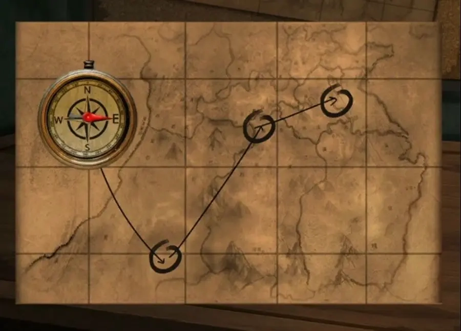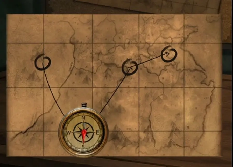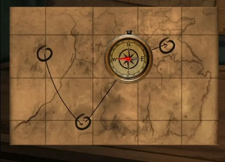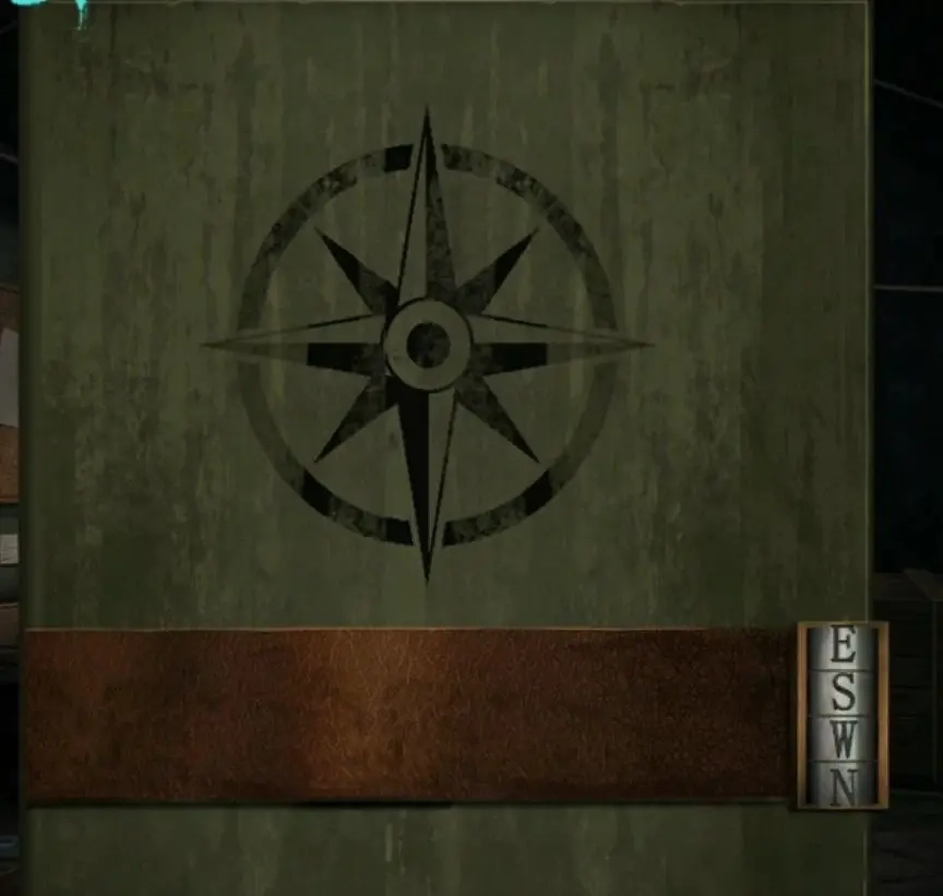 查看笔记本可知密码是NSWE,接着我们在左侧桌子后方的地图处用指南针,就能得到四个方位——ESWN,把密码调整成这个后,果然成功打开了日记本。从日记本的第二页取出钥匙,再用这把钥匙打开右侧桌子上的铁盒子,就能拿到石牌和一小段绳子了。