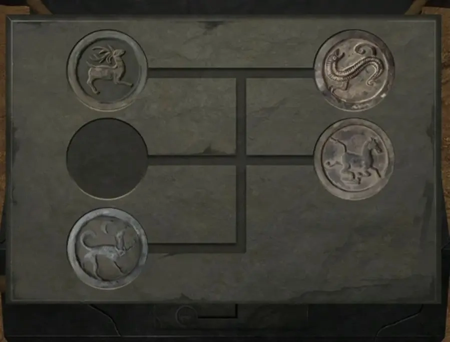 继续往前走,抵达断桥场景后,先对左侧的树使用登山绳,接着查看右侧的石碑,同样用登山绳操作就能完成捆缚。此时,没用的道具会自动消失,剩下尚未解开的谜题就只有小庙旁那个可移动的滑块了。返回后尝试滑动几次,会发现滑块每次只能左右移动一格,一旦滑动错误就会重置到初始位置。因此,多尝试几次就能找到规律:按顺序将滑块滑到2-3-4-3-2-3-4-5的位置,暗格便会打开,从中可取得石盘。