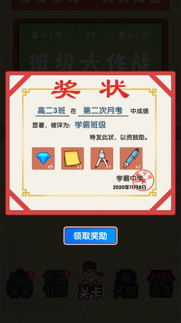 通过参与各类任务与活动获取金币、道具等物资,这些物资可用于提升角色等级以及强化班级整体实力。