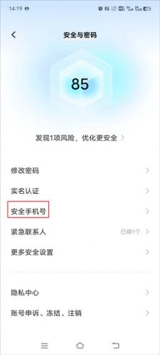 3、接着点击安全手机号;