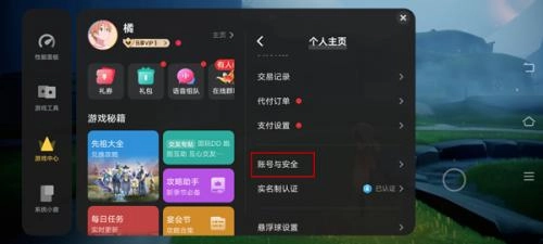 2、然后滑动屏幕左侧,出现vivo游戏中心,点击主页,下滑找到账号与安全;