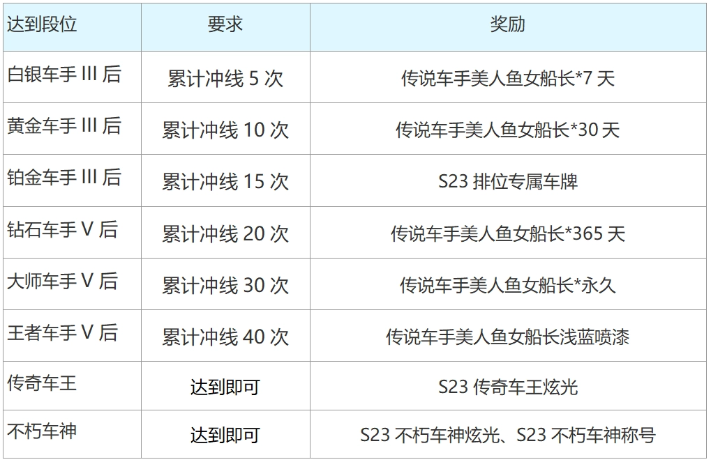 本赛季的奖励内容十分丰富,有美人鱼女船长这款限时与永久的传说车手,还有S23排位专属车牌以及美人鱼女船长的浅蓝色喷漆。此外,专属车王的炫光、车神定制炫光和对应的称号也都包含在内哦~