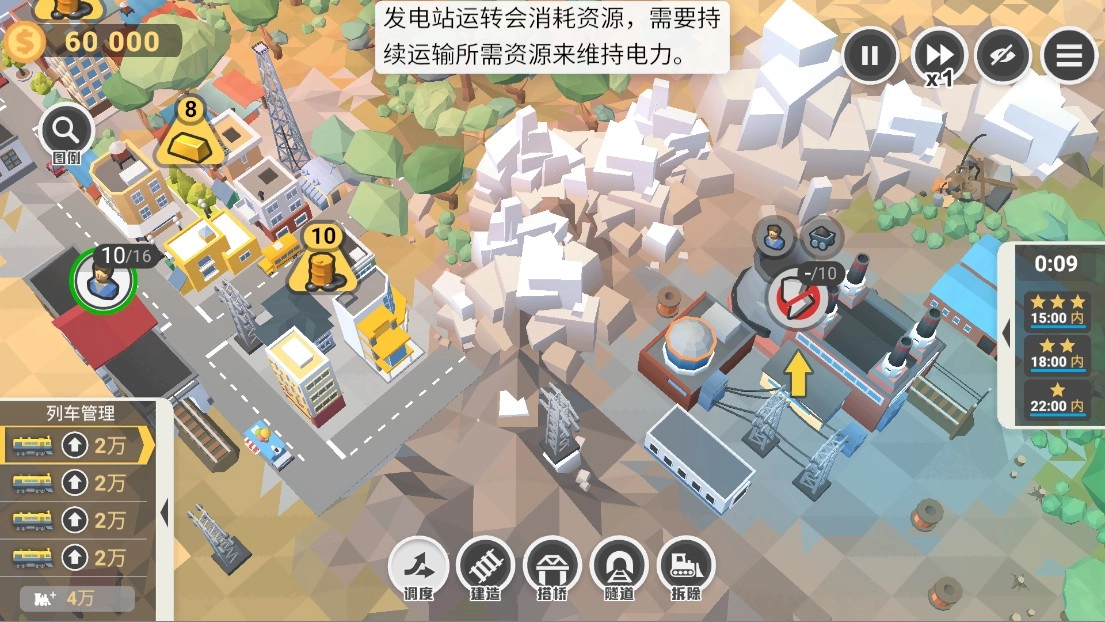 流程步骤如下:首先,开局阶段资金十分紧张,隧道工程成本高昂,务必避免盲目开凿。建议优先在右侧城镇中间的隧道附近开设砖厂,这样既能保障初期通过售卖砖块获取稳定收入,而且即便本关的物资需求已经满足,也需要持续运营砖厂(成品可以暂时不运出),否则后续28万的资金缺口难以填补。等隧道开凿完成后,先铺设右侧通往砂石厂的铁路并安排工人;接着再铺设砖厂到隧道或左侧区域的铁路。