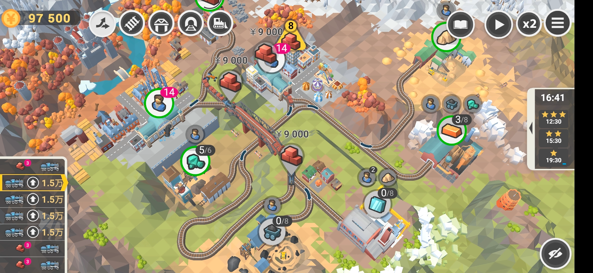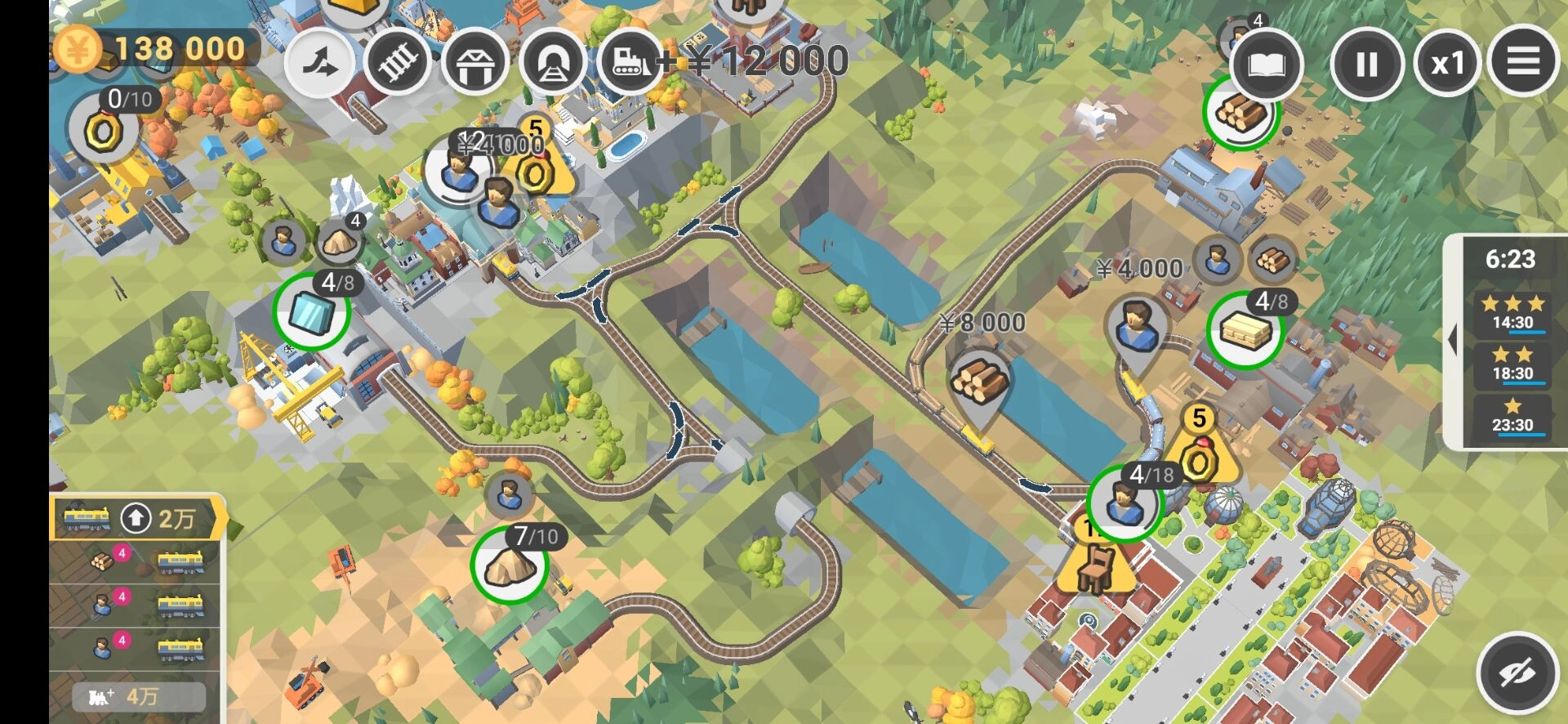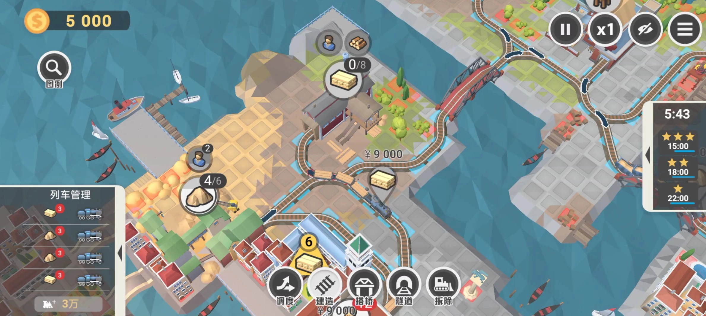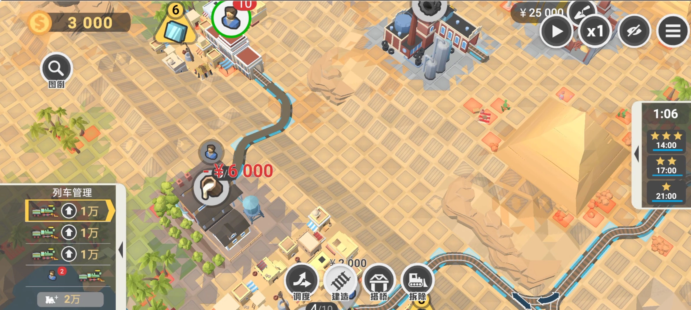 5,继续存钱到刚好够1w,然后铺设从桥到砖头厂的铁路,接着运输砂石到砖头厂,生产完成后再把砖头运到右侧城镇。要注意在生产期间持续让砂石厂工人数量拉满,运输时别发生碰撞就可以了。