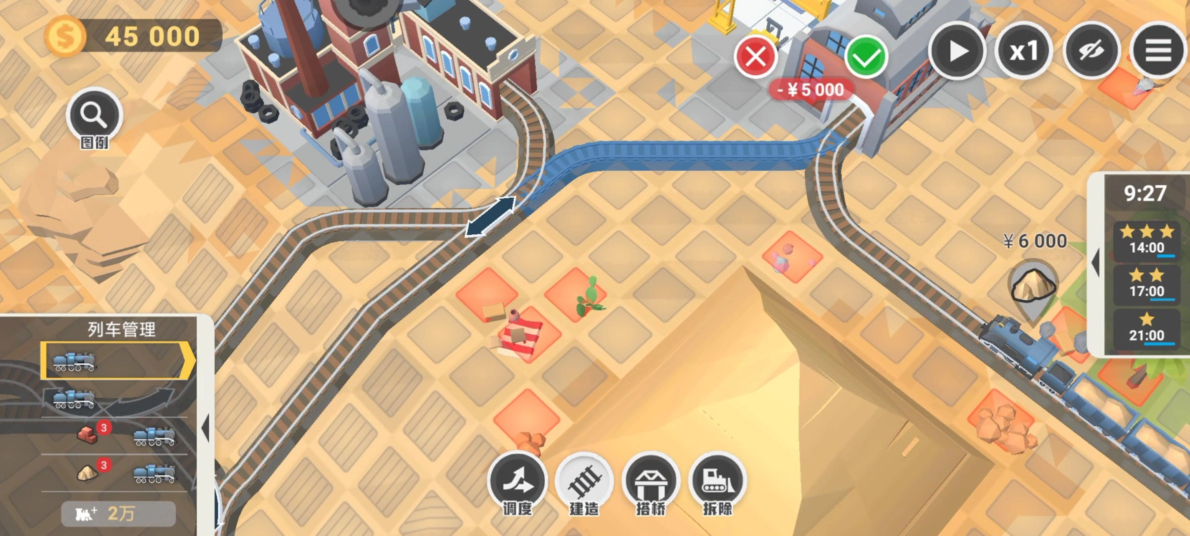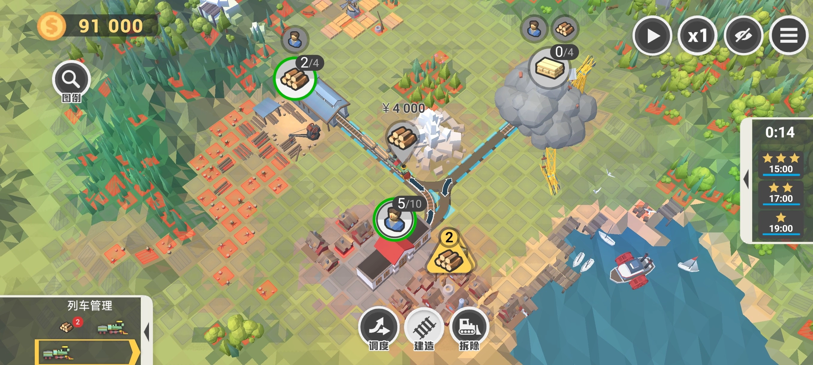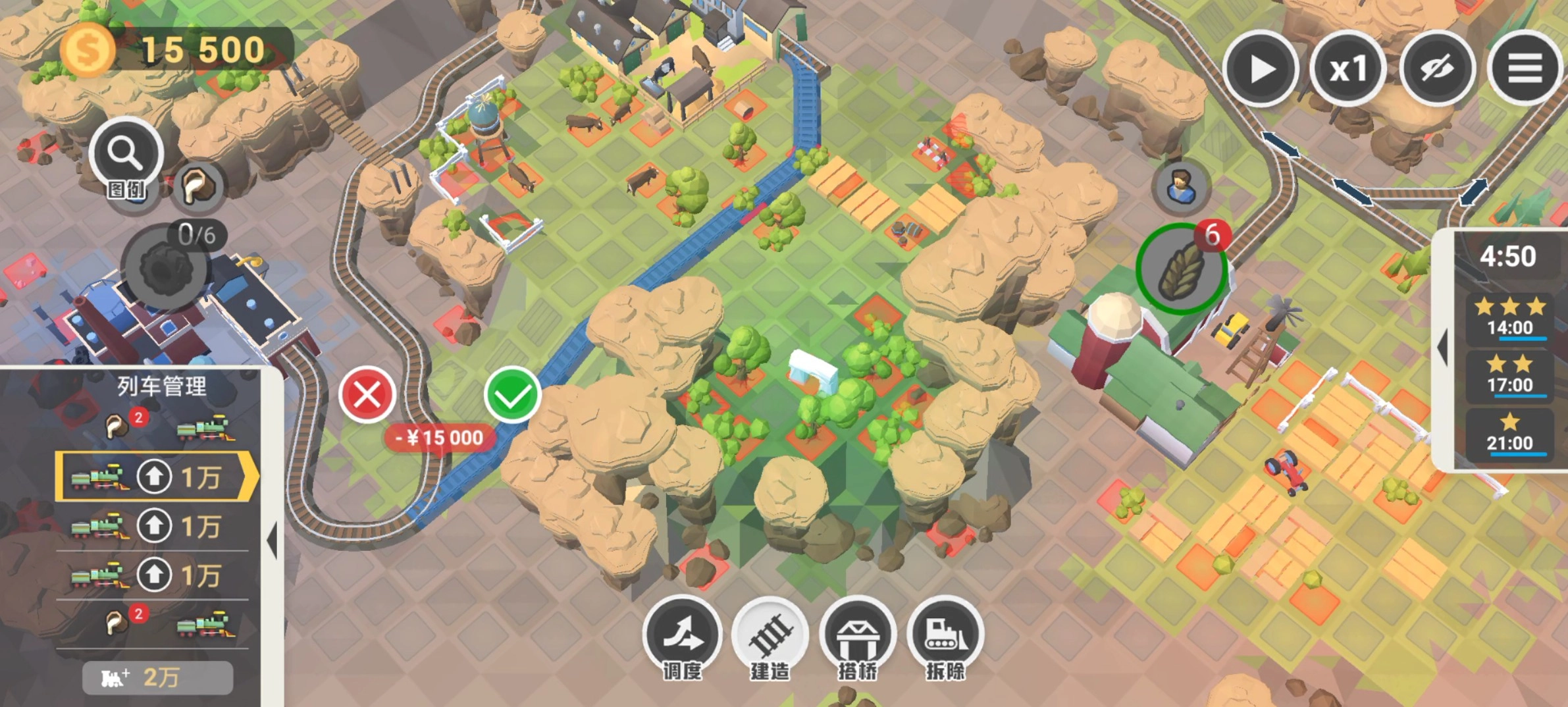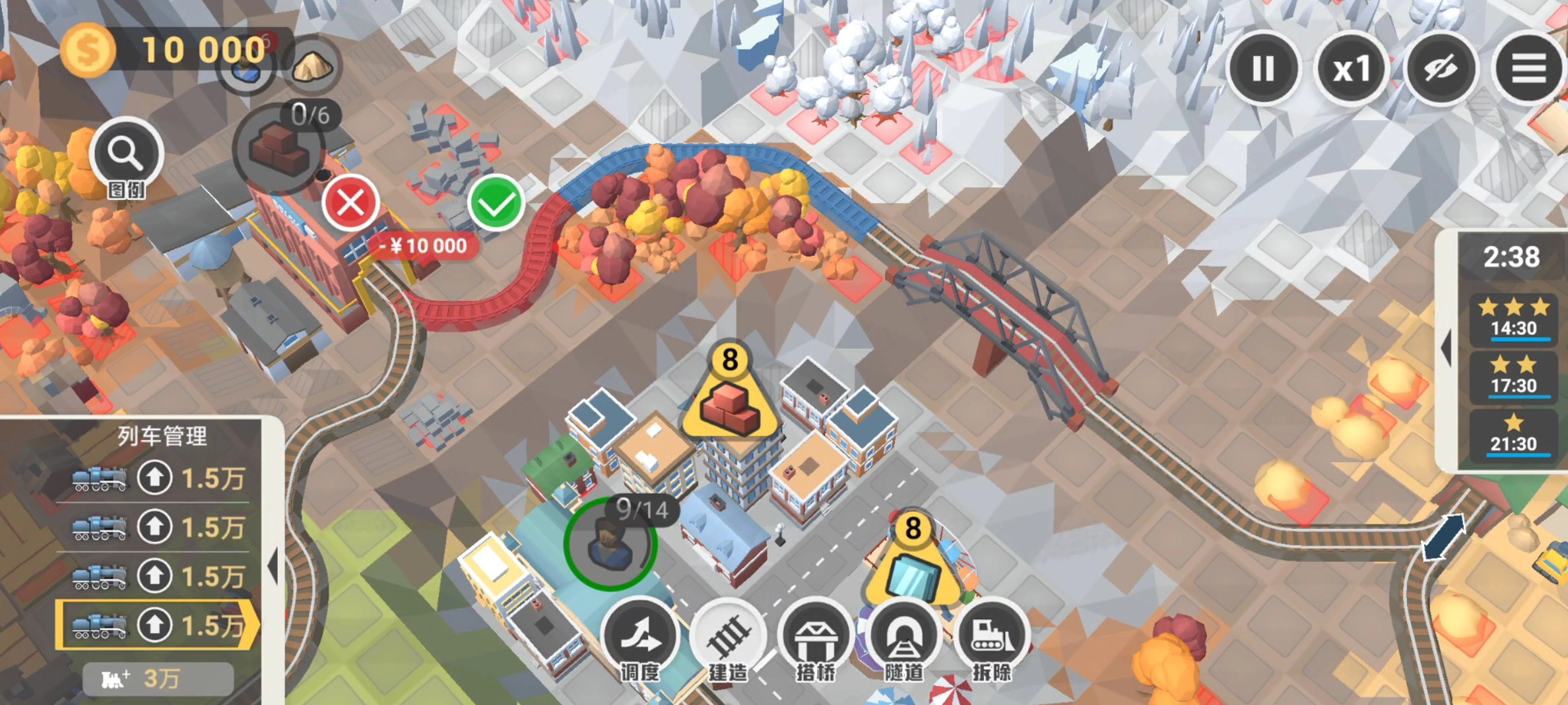 5,继续存钱到刚好够1w,然后铺设从桥到砖头厂的铁路,接着运输砂石到砖头厂,生产完成后再把砖头运到右侧城镇。要注意在生产期间持续让砂石厂工人数量拉满,运输时别发生碰撞就可以了。