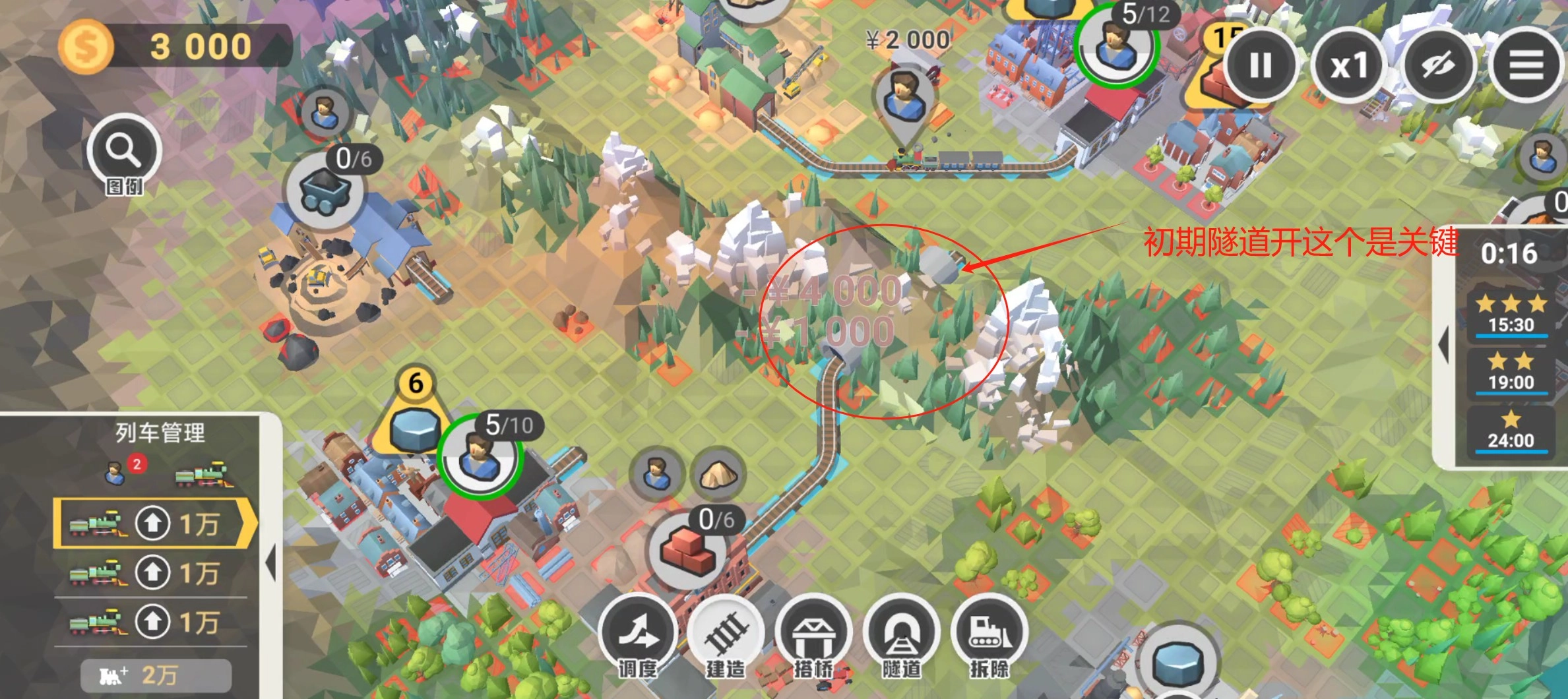流程:1,本关就一个城市,但是分左边两边的路口。铺设城市右侧路口到右侧金矿的铁路,派遣6到9个工人(1000=1个工人)。