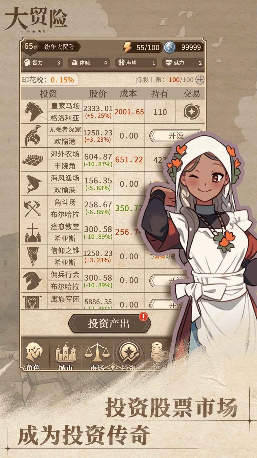 在大贸险的商业世界里,你可以开展模拟经营交易活动:从羊毛、小麦这类基础物资,到辉光底香这类特色商品,从矿山、农田等生产源头,到帝国商行这样的贸易枢纽,你将通过买入卖出各类繁杂货物,凭借合理的交易规划与经济策略,一步步打造属于自己的商业帝国!