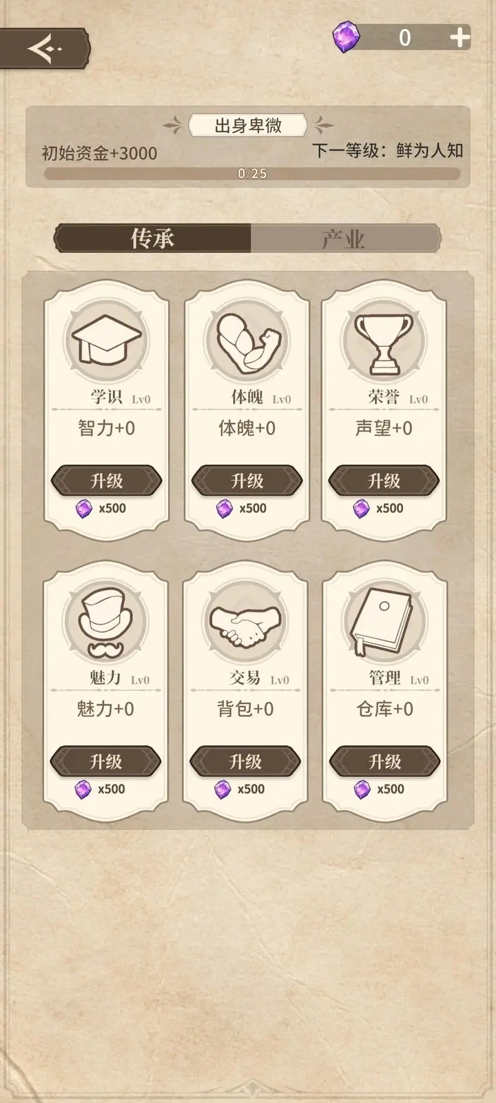 每一局(人生)根据取得成就获得传承宝石,用来提升起始的各项属性和银币(如图)