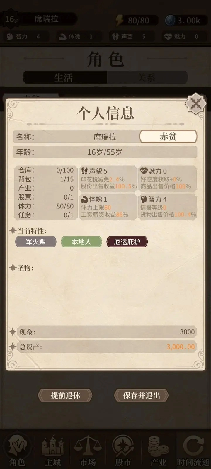 rougelike游戏,每个人的人生都像一局游戏,从16岁起每过一年算一个回合,直到因年龄到限退休或破产才结束。