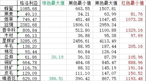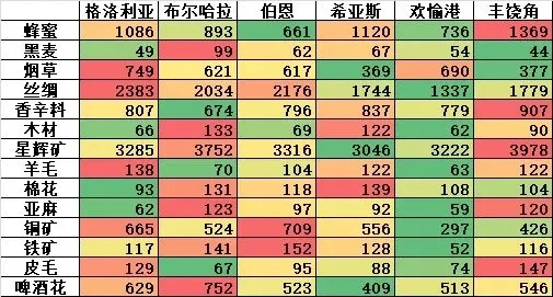 关于各城货物的平均价格,图8和图9呈现的是上一版本的数据,可供参考。其中,格洛利亚、伯恩与布尔哈拉这几座城市的数据相对可靠。需要注意的是,城市货物价格每回合的波动幅度较大,根据开发团队的说明,这一波动在每局游戏中是随机设定的。