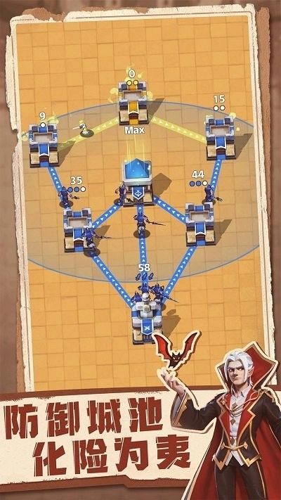 搭建合适的防御塔,在进攻时能协助你的战士打击敌人,从而让他们更快地逼近敌方城堡。