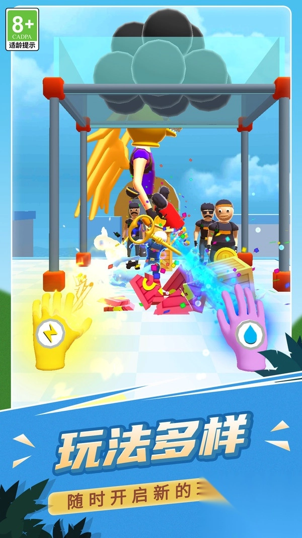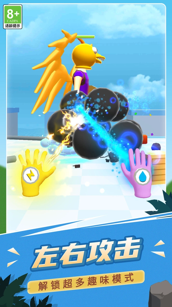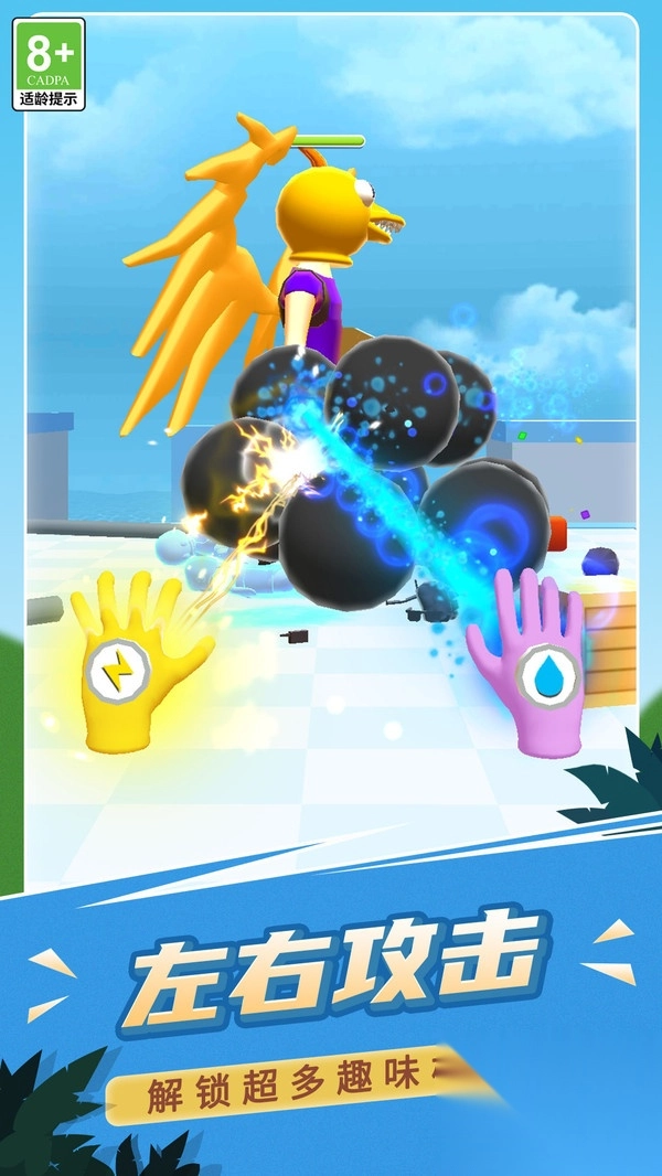 《小心炸飞你》是一款超刺激的解压格斗游戏!在这里,你将化身为正义勇士,戴上酷炫的技能手套,用闪电、水流等强力技能狠狠痛击匪徒。游戏里还有超多丰富的装扮和技能等待解锁,你需要在关卡中精准出击,打败那些凶恶的敌人,赢得最终胜利。不管你是想休闲解压,还是挑战高难度关卡,这款游戏都能让你爽到飞起!快来开启你的热血战斗之旅吧!