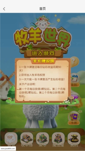 68用68钻石可以兑换一张羊卡牌,这张卡牌能带来每日钻石收益:兑换后的第一个月,每天固定获得3钻石;第二个月,每天固定获得2钻石;第三个月,每天固定获得1钻石,以30天为一个周期计算收益。需要注意的是,每个用户仅能激活一张羊卡牌来获取收益,卡牌到期后可以继续激活以延续收益。每日获得的钻石,既可以用来兑换羊只,也能在集市中变现。