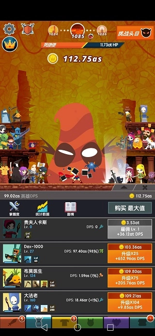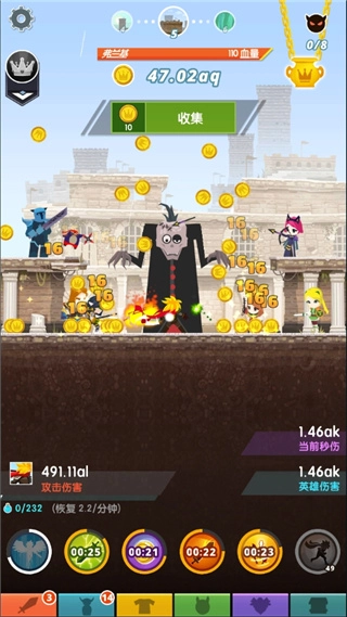 点击即可进行攻击、击杀、收集金币以及雇用英雄的操作。