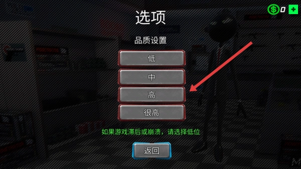 在游戏的选项界面中,点击高品质设置按钮后,即便系统提示可能出现滞后或崩溃问题并建议选择低档位,你依然可以尝试开启高画质来优化视觉体验,从而完成画面质量的设定。