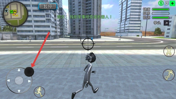 在游戏里操控左侧的虚拟摇杆,就能控制火柴人角色进行移动;接着按照提示在城市场景里搜寻军事坦克或者机器人,以此来推动任务进度。