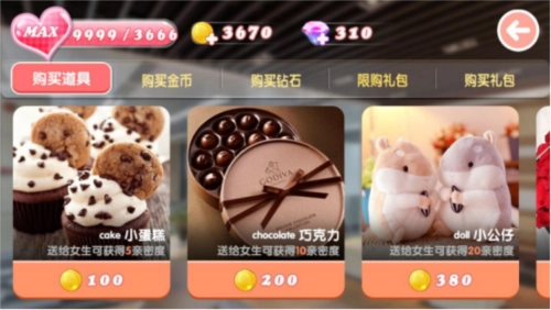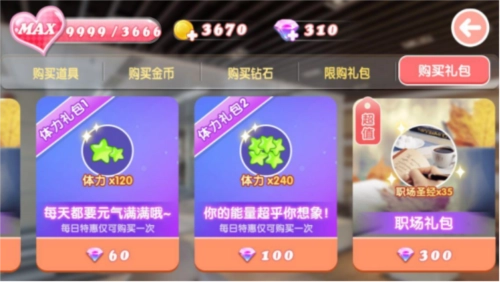 要是觉得推进过程比较吃力,你可以借助游戏里的《恋爱宝典》来快速增加好感度,也能购买“职场礼包”加快职业成长的步伐,这样就能更轻松地获得恋爱相关的资源了。