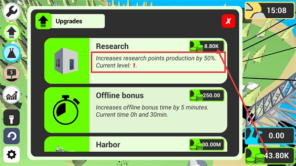 进入【Upgrades】界面后,建议优先选择【Research】升级项,消耗8.80K-资源即可将研究点产量提升50%,该升级项当前等级为1,有助于推进科技解锁进程。