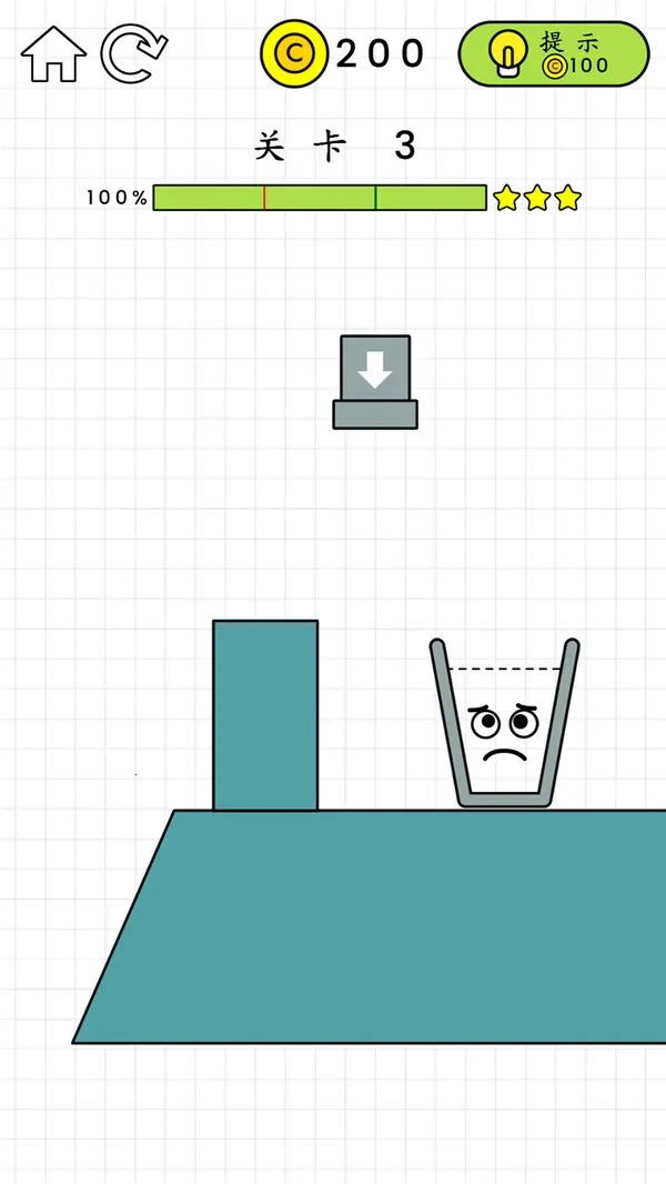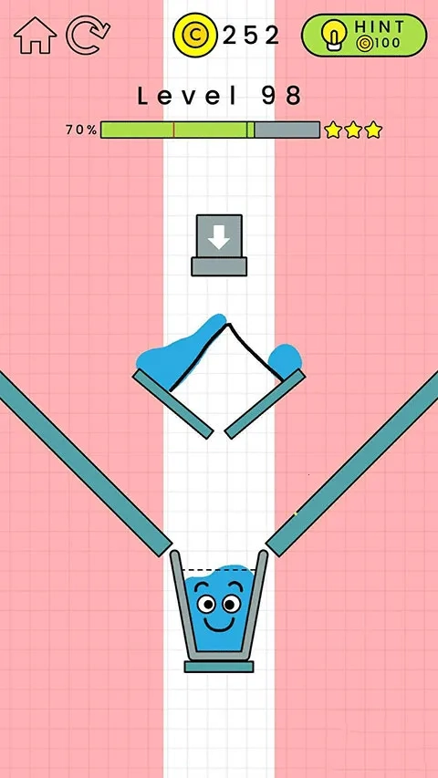 它能帮你解决休闲时想找乐子的困扰,带来别开生面的体验。游戏界面简洁大方,场景千变万化,搭配轻松欢快的背景音乐与音效,让你沉浸在挑战的乐趣之中。关卡设计丰富多彩,每一关都独具特色,从第90关到第99关,每一关的解题思路都各不相同。例如90关需要引导水流注入杯中,91关有提示堪称送分关卡,92关则要在白色方格内画线使橙色条块掉落等。总而言之,欢乐水杯能让你充分享受脑力挑战的快感,尽情发挥创意,赶紧来试试吧!