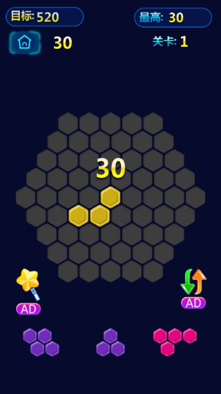 刚开始玩的时候别只局限于眼前的小范围,要养成从全局盘面去寻找“最容易组合”的六边形的习惯。优先处理那些靠近底部的区域。 2、消除之后,上面的方块会下落填补空缺,说不定能形成新的可消除区域。拿高分的关键是制造“连锁消除”,也就是一次消除完成后。 3、随着关卡的深入,玩家还得学会运用炸弹方块、颜色转换块这类特殊方块,同时还要应对会移动、会变色的干扰元素。