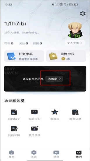 打开库街区App后,点击界面右下角的“我的”按钮,进入个人中心页面。在个人中心页面中,如果还没有绑定过游戏角色信息,会显示“还没有角色信息”的提示。点击该提示即可进行绑定操作。