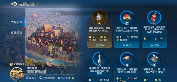 0~10分钟:新手引导阶段,进入游戏后跟着指引完成基础教学,解锁主线任务。所有建筑升级都按照主线任务的要求来进行(避免浪费资源),土地攻占也根据任务需求去完成。