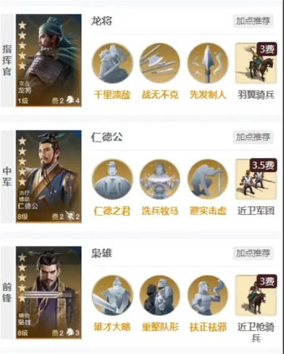 三国队阵容由龙将、仁德公和枭雄组成:核心输出龙将依赖叠层机制提升战力,仁德公与枭雄可快速为其积累高额层数,配合先发制人效果,能稳定持续触发伤害,叠加爆发后达成“战无不克”的压制力;辅助位仁德公兼具治疗续航与增伤增益,同时携带减伤与持续治疗技能,进一步强化龙将的生存恢复能力;前锋位枭雄承担主要承伤任务,且配备免控类技能抵御敌方buff干扰。