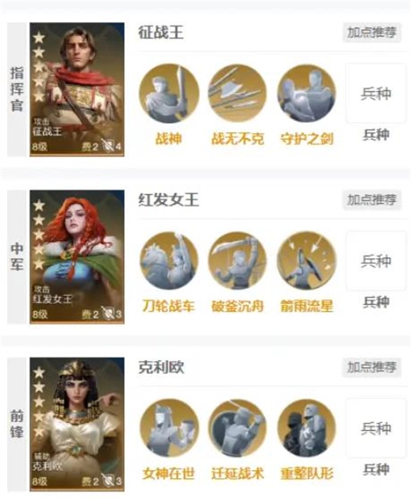 开荒阵容的选择上,主线任务赠送的3个4星英雄是系统免费提供的,开局就自带羁绊效果和时代兵种的加成。在游戏开始的1-2天里,这套阵容的强度处于峰值,足以应对1-6级的打地任务。等后续拿到五星英雄组成新阵容后,这3个4星英雄还可以留着作为补刀队或者铺路队来使用。