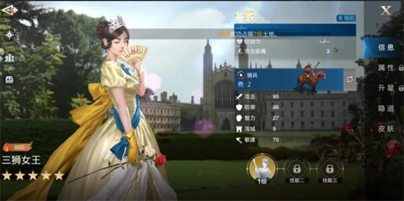 三狮女王定位辅助武将,兵种为骑兵,普攻覆盖范围3格。其核心技能【王冠】是开场即可触发的效果,作用距离2格,触发概率100%,属于侧重前期进攻压制的技能类型——能同时强化英雄的追击伤害与连击表现。该技能机制直接高效,尤其适合与自带追击技能或高输出特性的英雄组合搭配。适配阵容推荐:雄狮王、三狮女王与铁公爵的组合;库比、三狮女王加铁公爵的组合;以及吉加美士、三狮女王搭配铁公爵的组合。