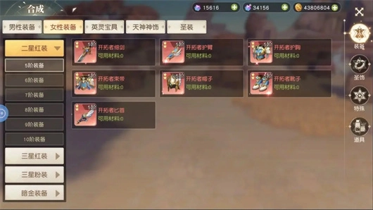 男性装备:性别为男性的职业装备合成,可以将橙色2星装备合成红色2星装备,红色3星装备合成粉色3星装备,粉色3星装备合成粉色4星装备,粉色4星装备合成幻彩5星装备。