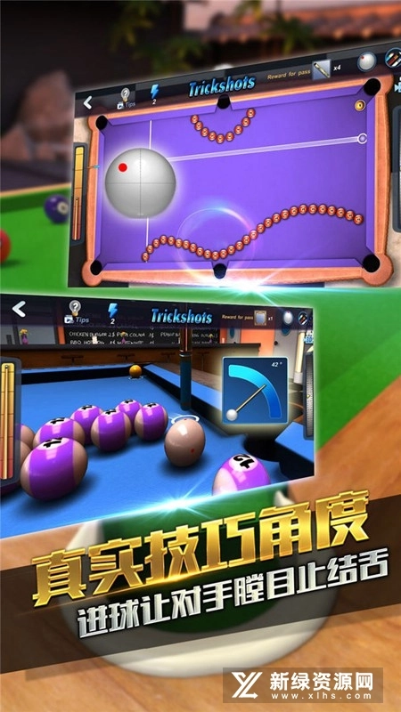 1.丰富玩法模式,随心挑选挑战 2. 包含8球、9球、斯诺克、花式解球等多种类型