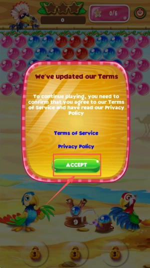 2、在条款更新页面阅读相关说明后,点击「ACCEPT」按钮以确认同意服务与隐私政策,随后即可继续进行游戏。