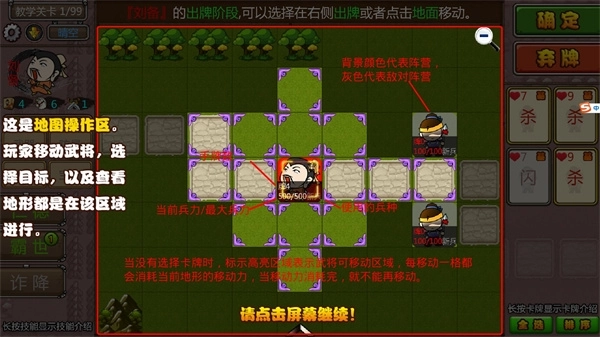 武将的兵力等同于其HP值,当兵力降至1以下时,需向其他武将请求支援;若求援未成功,该武将将被击退。在弃牌阶段,每拥有100点兵力,武将可额外保留一张手牌。行动力方面:回合开始阶段会自动增加6点(部分坐骑可提升此数值),且本回合的行动力仅限当回合使用;选择目标地点移动时会消耗行动力,不同地形的消耗数值不同,部分地形甚至无法进行移动操作。