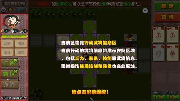 3、武将行动流程:武将的行动依次划分为回合开始、状态结算、摸牌、出牌移动、弃牌、回合结束这六个阶段,需依照该流程进行操作。