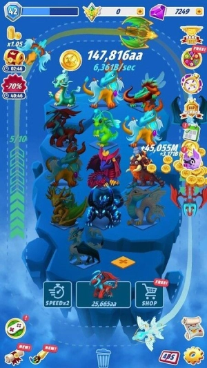 在魔法世界的奇幻背景下,《巨龙进化:最佳合并闲人》是一款放置合成类游戏。你需要把龙蛋、幼龙和各种生物进行合并,通过持续合成来解锁更高级的物种。游戏利用独特的魔法设定,让你能够探索一座座神秘岛屿,在简单轻松的合并操作中,尽情享受培育与进化带来的乐趣。
