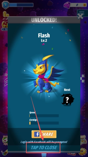 4、最后,如果进度停滞不前,点击“TAP TO CLOSE”关闭提示,继续快速点击或者等待挂机收益,循环操作以解锁更高等级。
