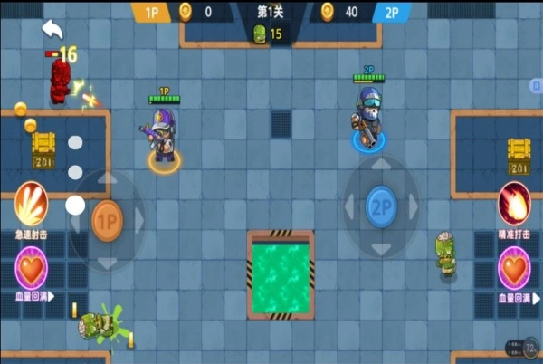 2、支持1P与2P角色选择,不同角色在血量、伤害、技能等属性方面各有不同,能够依据战斗需求搭配适宜的角色。